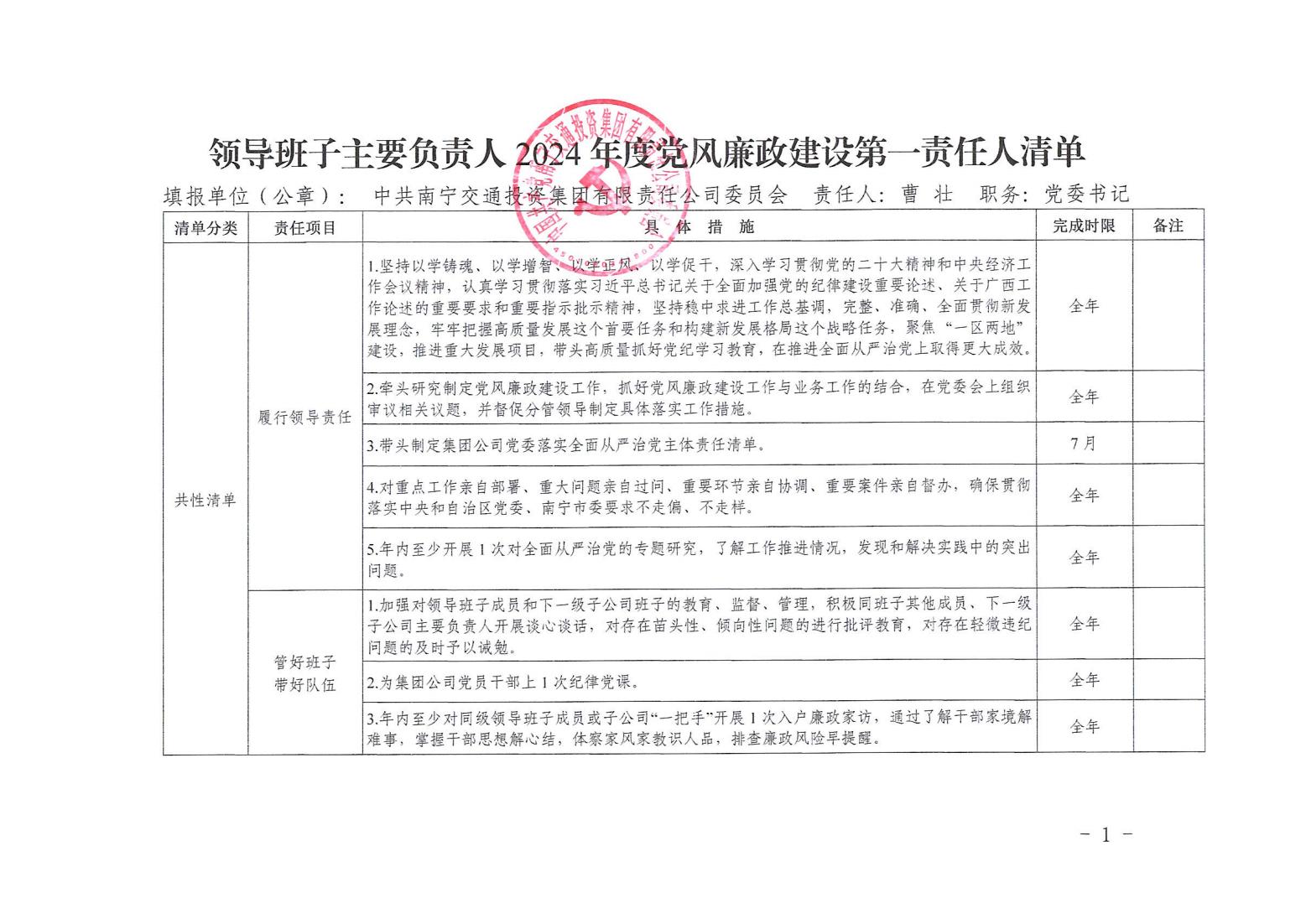 領導班子主要責任人2024年度黨風廉政建設第一責任人清單