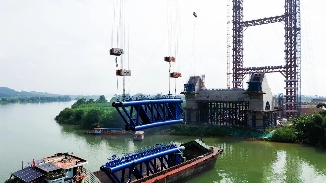 8月8日,南寧南過境線(吳圩機(jī)場至隆安延長線段)公路上正右江特大橋首節(jié)拱肋順利完成安裝,標(biāo)志著這座項(xiàng)目關(guān)鍵控制性工程正式進(jìn)入拱肋安裝的重要階段。
